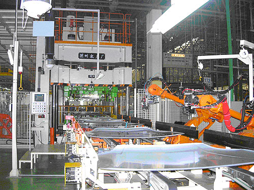 車門包邊液壓機是為汽車制造廠開發(fā)的專用液壓機,具有速度快、自動化程度高、工作柔性化程度?等特點,廣泛應(yīng)用于于汽車車門的包邊工藝。本系列液壓機由主機和快速換模系統(tǒng)組成,快速換模系統(tǒng)采用具有自主知識產(chǎn)權(quán)的移動工作臺模具置換裝置,包括多只移動?作臺的組合、換模小車、儲模系統(tǒng)和模具快速夾緊系統(tǒng)、控制系統(tǒng)。