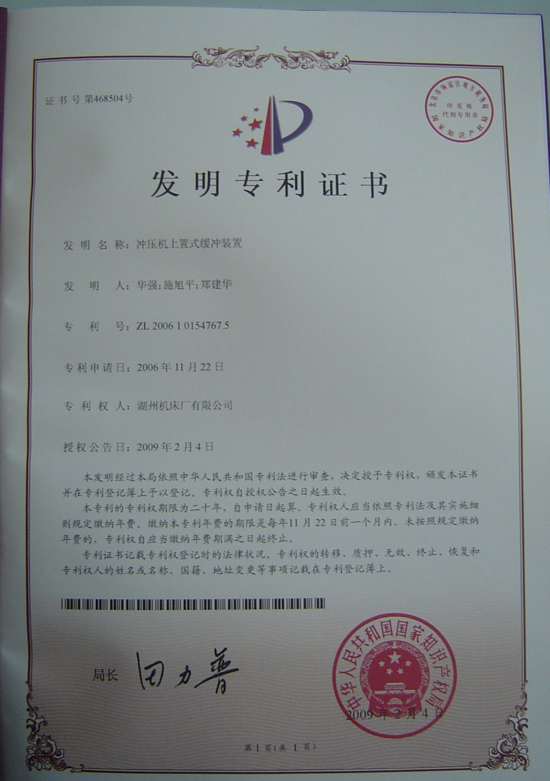 探索更多我公司申請的“沖壓機上置式緩沖裝置”,經(jīng)國家知識產(chǎn)權(quán)局依據(jù)中華人民共和國專利法審核,已于2009年2月4日獲國家發(fā)明專利授權(quán)。